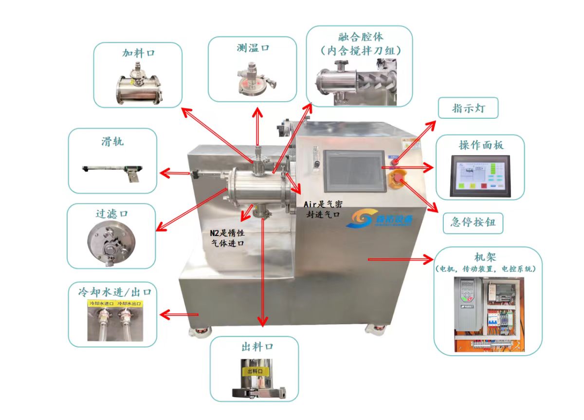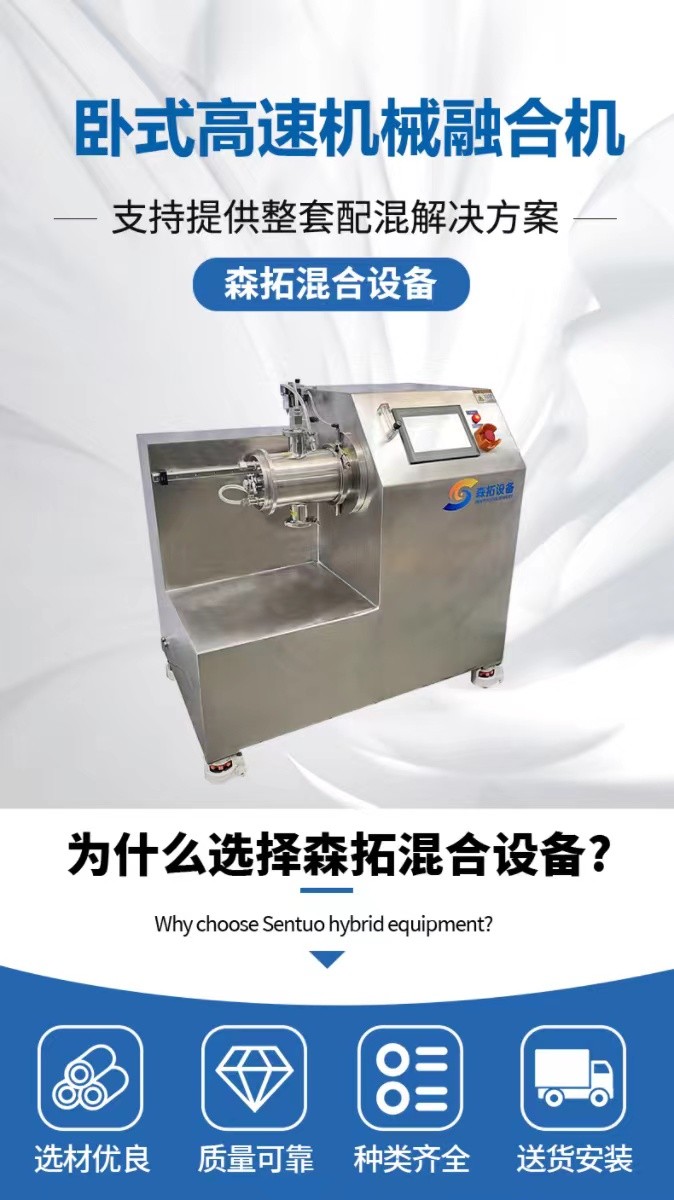 臥式高速機械融合機為物料在封閉融合腔內受高速旋轉刀組和缸體擠壓和剪切, 使物料經歷混合,表面包裹,深度壓實過程,從而形成一個新的多材料結合體。納米級粉體材料包裹在微米級材料表面并壓實融合,形成一個復合體.