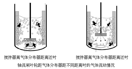攪拌槽內的氣體分散大致有以下幾個狀態:氣泛狀態(大部分氣體未分散,氣泡沿攪拌軸直接上升到液面),載氣狀態(氣體基本得到分散,分布器以下分布不良),完全分散狀態。