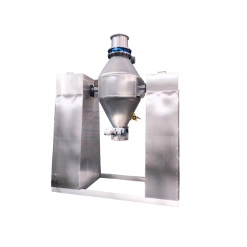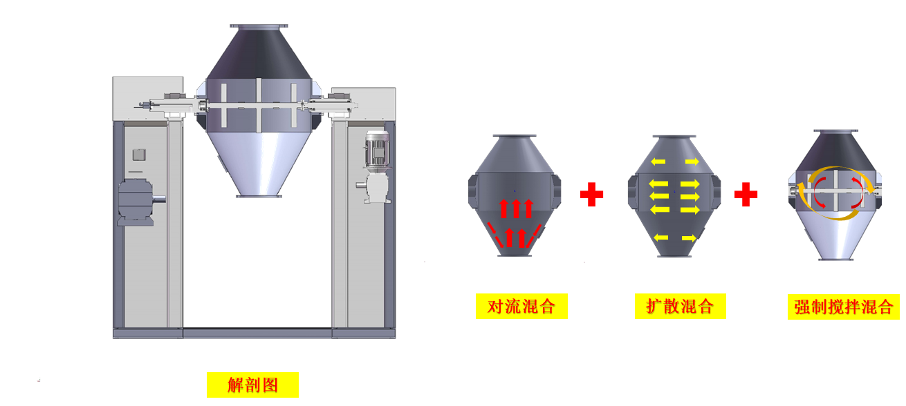 工作時采用真空輸送將粉末或人工加料到雙錐容器中,隨著容器的不斷旋轉.物料在容器中進行復雜的撞擊運動,達到均勻的混合效果。